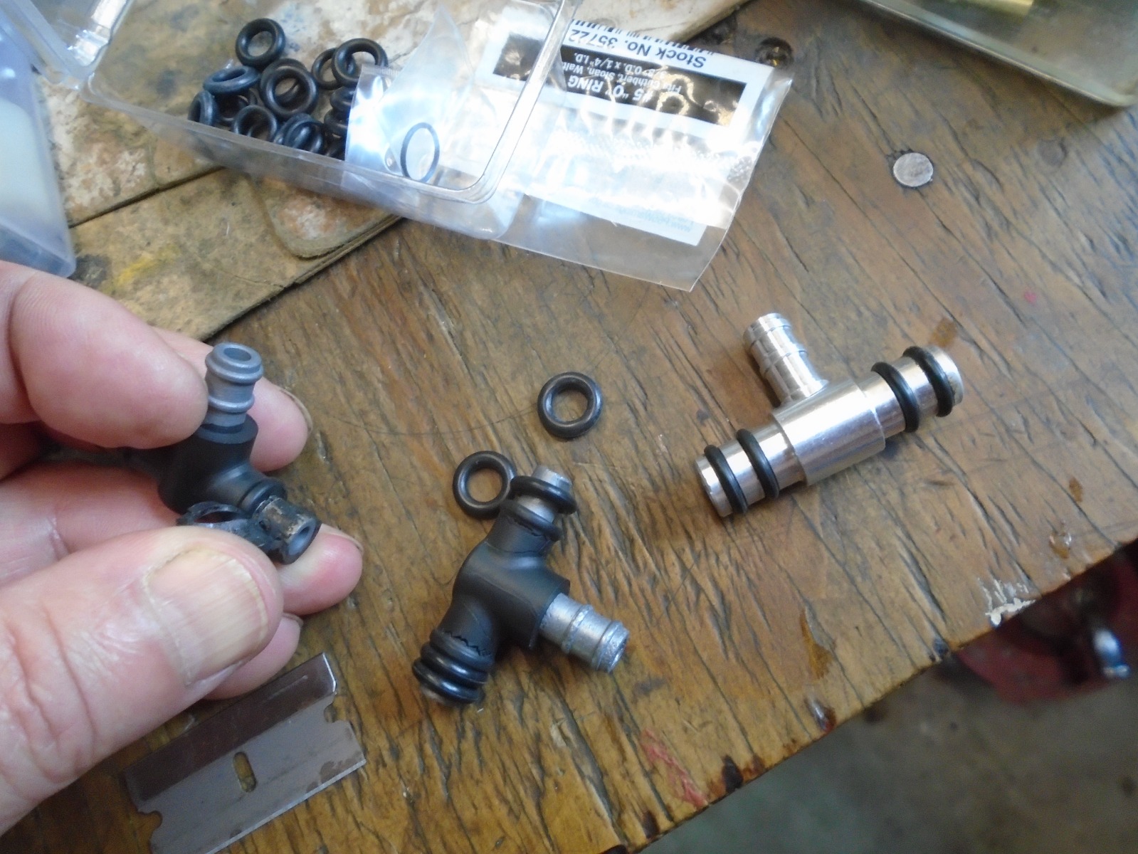 Clay, will you sell me some of that o-rings, with postage to germany?? ...Unable to get them here in this dimensions....(I'd like to try that out, with the two stripped original T-pieces! -So far, I've always either used new connectors or made my own on the lathe...but that's always quite time-consuming, so I'd like to try this solution! This idea looks good for me!)