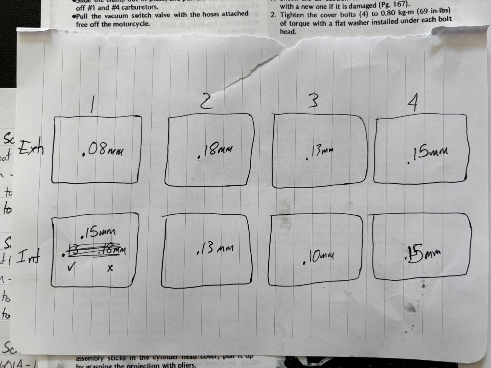 I’m not sure if this should be a new post in a different section or not. Put in 8 heat range plugs this morning and fired it up. Idles okay but if I hold the throttle around 1500-2000rpm for a few seconds and let off it almost dies. Also tried to take it down the street after it was warm and as I let off the clutch it will die as well unless I give it a ton of throttle. I heard a faint tick sound from the top end every 20 or so seconds, it wasn’t cyclic so I decided I was going to pull the valve cover off and check my valve clearances. Here is what I measured.