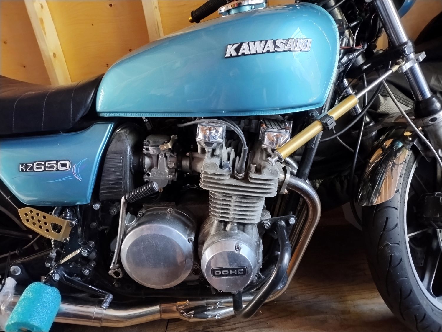 1978 KZ650 C2, 130K kms, Delkevic ex, EI, CVK32, PMC easy clutch, ATK fork brace, steering damper, braced swingarm, ZRX shocks, 18" Z1R front wheel.