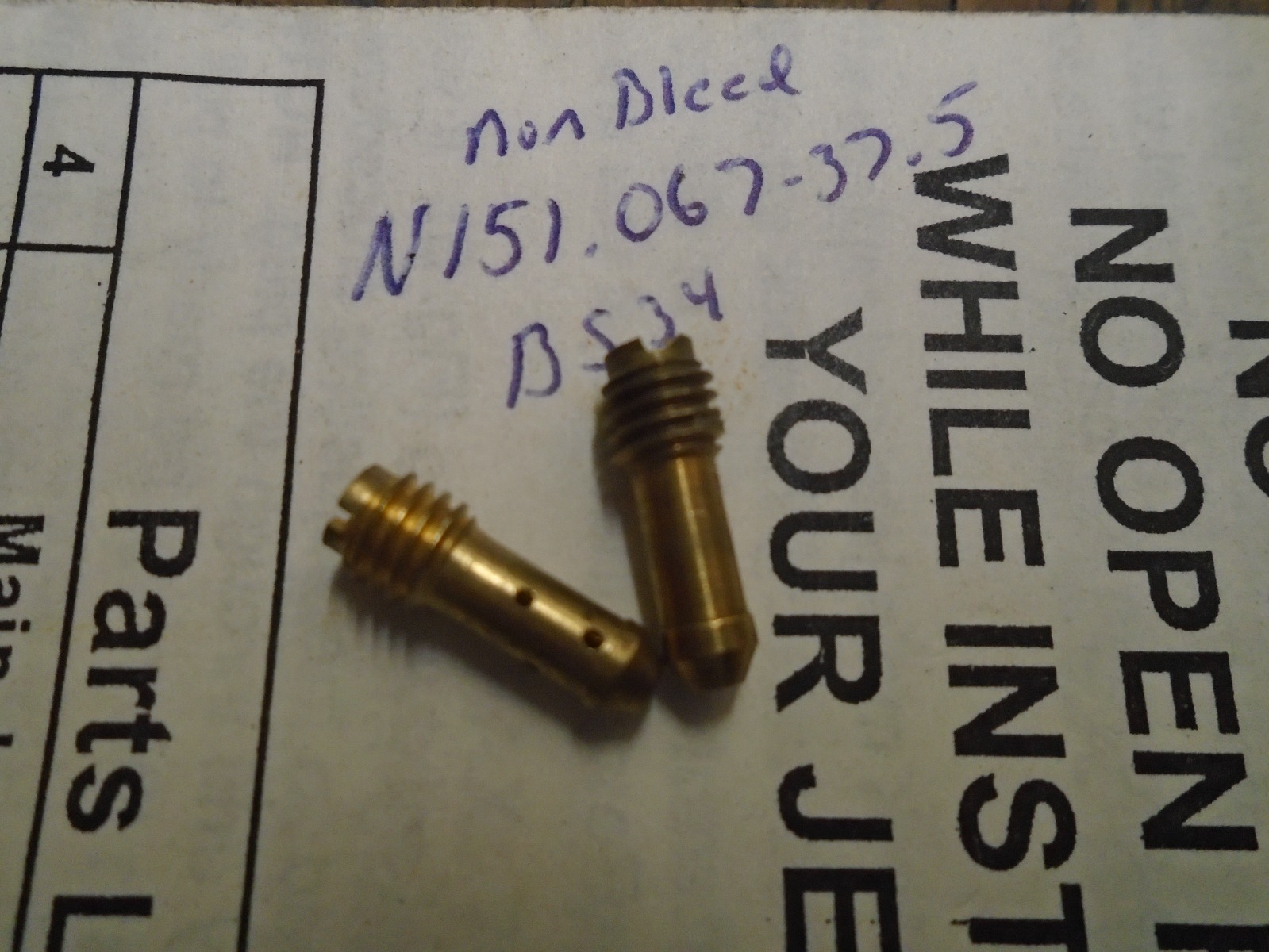 Something to verify. When You are considering changing out those Pilot jets, check them puppies when you pull them out. I've Never had to change the 37.5's even when running a sidewinder pipe and pods on a 1075 set-up. All pilot jets are NOT built the same. They had BLEED and NON-BLEED types as shown. Make sure you have the correct ones in there and not some Chinese knock-offs. And..NO, those fuel adjust screws shouldn't be 3.5 turns out, something is a-miss. The reason i mentioned the possible loss of vacuum initially.