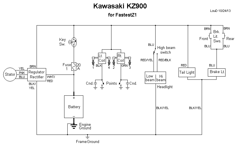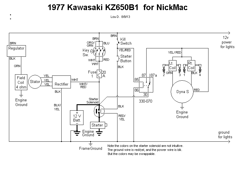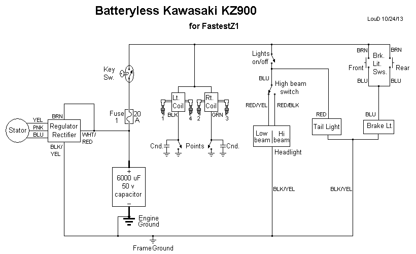 Please can you assist me. The brown wire from the regulator, this wire powers the lights etc correct. I am copying your drawing for Johns kz1000.i have a 4 switch ignition. 1. Ignition. 2 battery.3 acc.4 starter.