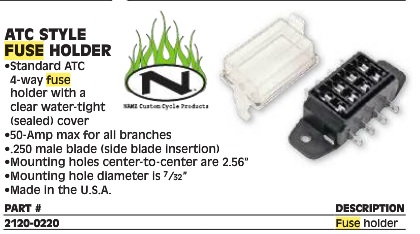 Holds 4 fuses. My local small Kawasaki dealer can get anything that's in the Drag Specialties Fatbook.. The back was open so I glued a bit cut from a old mudflap in place to seal. There are probably newer and perhaps better options on the market since I did this