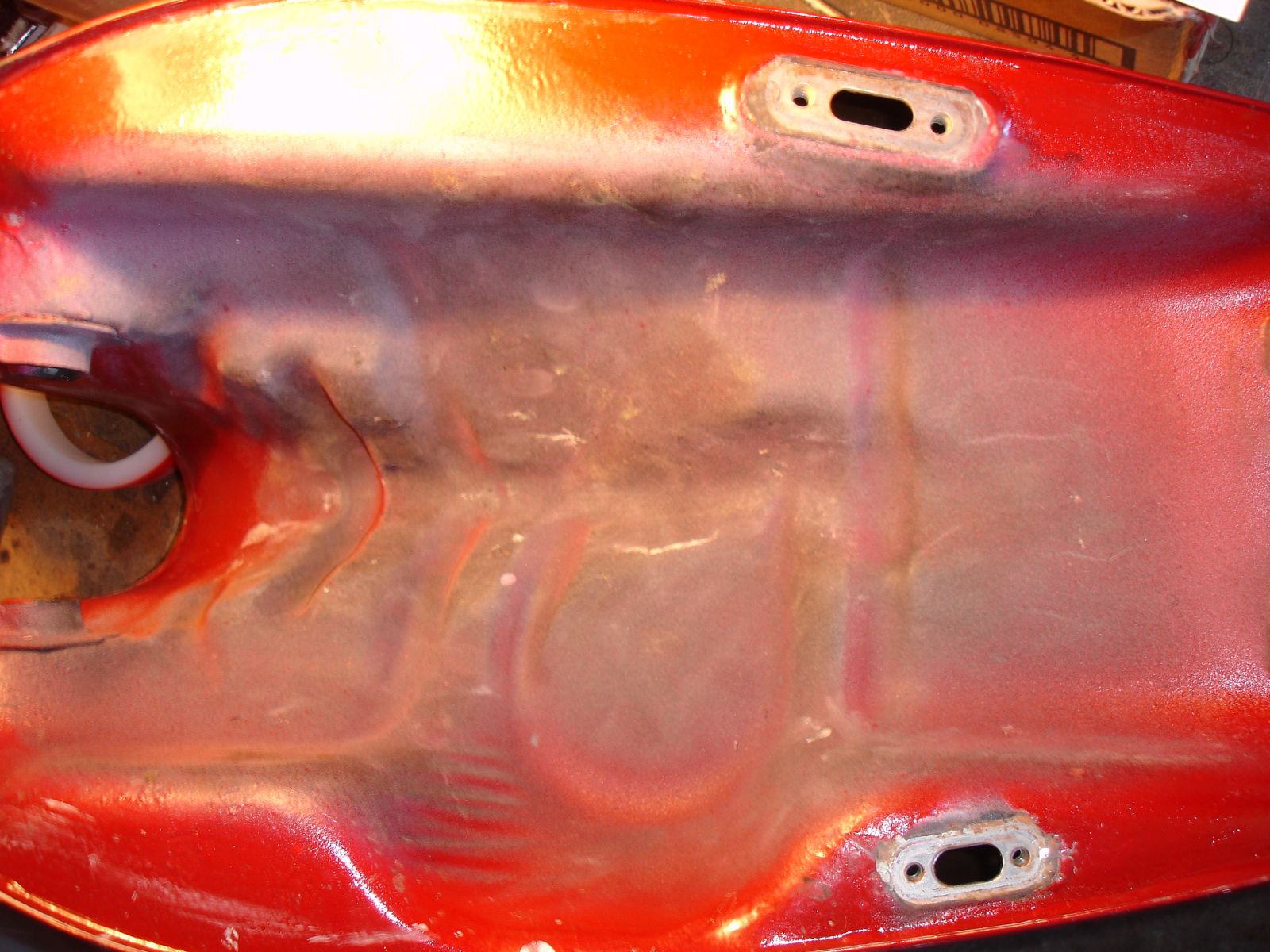 On the top side is the position for the petrol tap, the bottom is the switch hole. Just to the left of it is a recess with a large round flat towards the top of the tank. This is I think where the LTD (mine is the CSR) has the sensor mounted.
