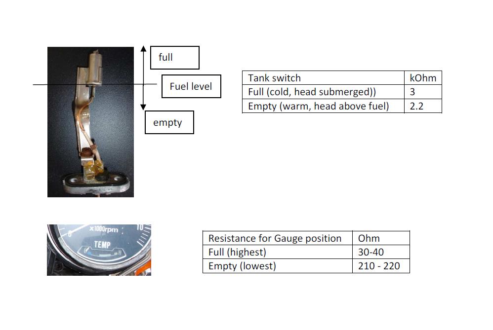 So it is just a straight forward on/off or low and high resistance when the fuel is belowor above the thermistor level. This is what I measured and this is what I need to get my gauge showing the right information. C (cold) is empty and H (hot) will be for full.