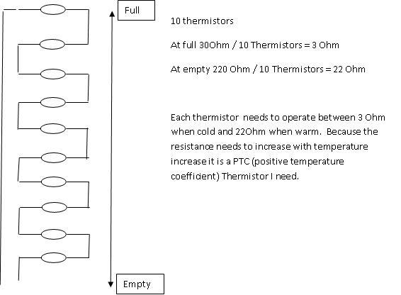 Never thought trying to get some a bit special electronic components is so difficult. If you don't want to buy a container load from China nobody wants to know. I finally found a place which used to be a shop I went to when I was younger, which is now on-line and ships the components. Not cheap, but at least I am able to get something which I can use. So the thermistors are on the way and I hope it will give me at least some results to work from. I found a thermistor which has 3 Ohm @ 25deg with a positive coefficient, i.e. increases in resistance when getting warmer. This is what I need when the fuel does not cover the thermistor cooling it down.