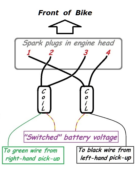 Keep in mind, the wiring is reversed for the 550’s, 650‘s,700’s, and 750‘s, that is the RIGHT coil primary will be two wires, RED and BLACK with the secondary(sparkplugs) going to #1 and #4.