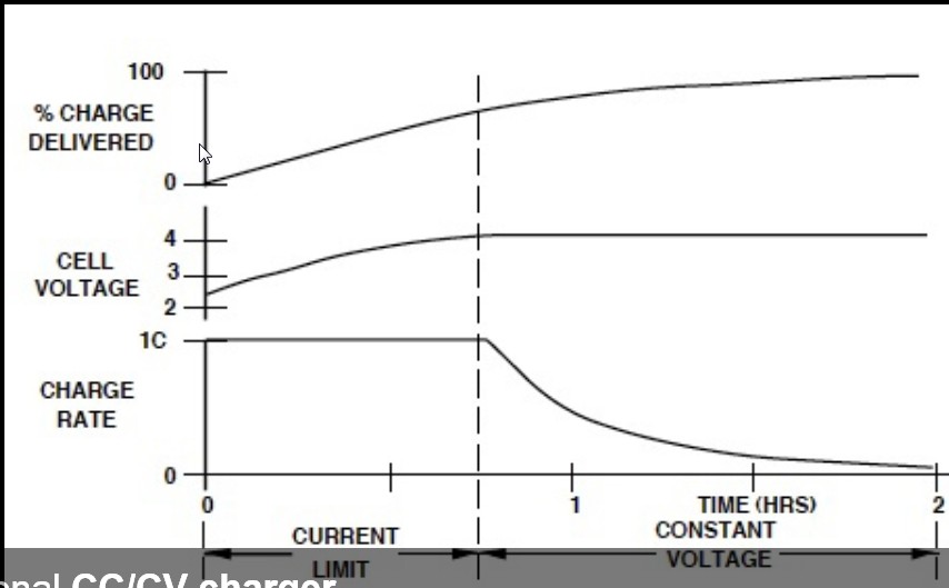 17 Feb 2016 18:14 - 17 Feb 2016 18:18I found this plot of a typical CC/CV charge mode for an Li battery. It shows how the charger holds the current constant until the battery voltage reaches the "set point" then it tapers off the current and holds at constant voltage (this plot is for a single 4.2V cell). This is the ideal characteristic for Li charging. A bike's electrical system has nothing to limit the max current during the CC mode.