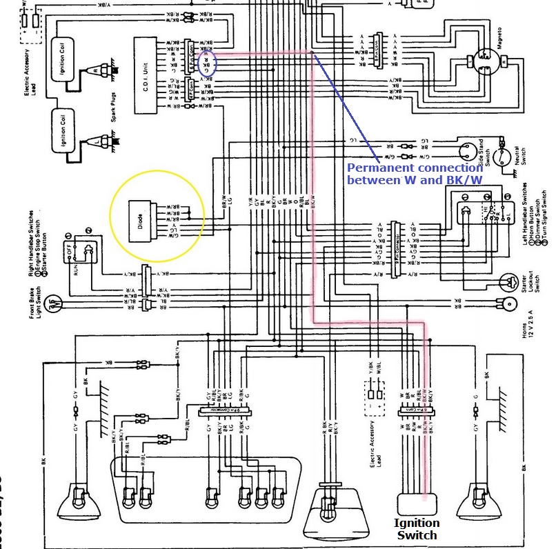 punisher11b wrote:That did seem troubling as they are currently shorted to ground....the plot thickens. :silly:Patton wrote: Am not at all positive, but seems to me that W (among those circled in blue) from CDI is NOT grounded, but actually connects to BK/W from the ign switch.
