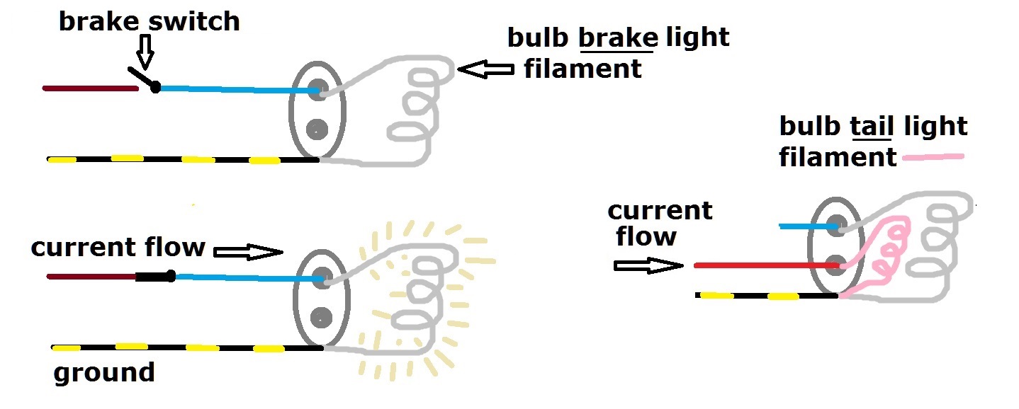 Both rear bulb filaments (tail light and brake light) are grounded via the same black/yellow wire that probably connects via a bullet connector to a black/yellow wire from the harness.