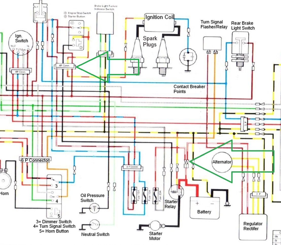 1) Dis-connect the the 4P connector to kill/start switch & Red/White conductor feed to the Regulator....