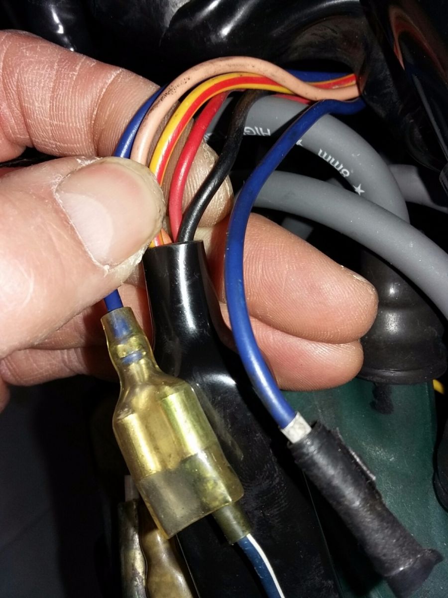 Then there are two blue wires. One with a double bullet socket which is connected to the blue and white from the 10 amp fuse to power headlights and then another one that has a white tip at the bullet although in the picture it has black insulting tape over the end.