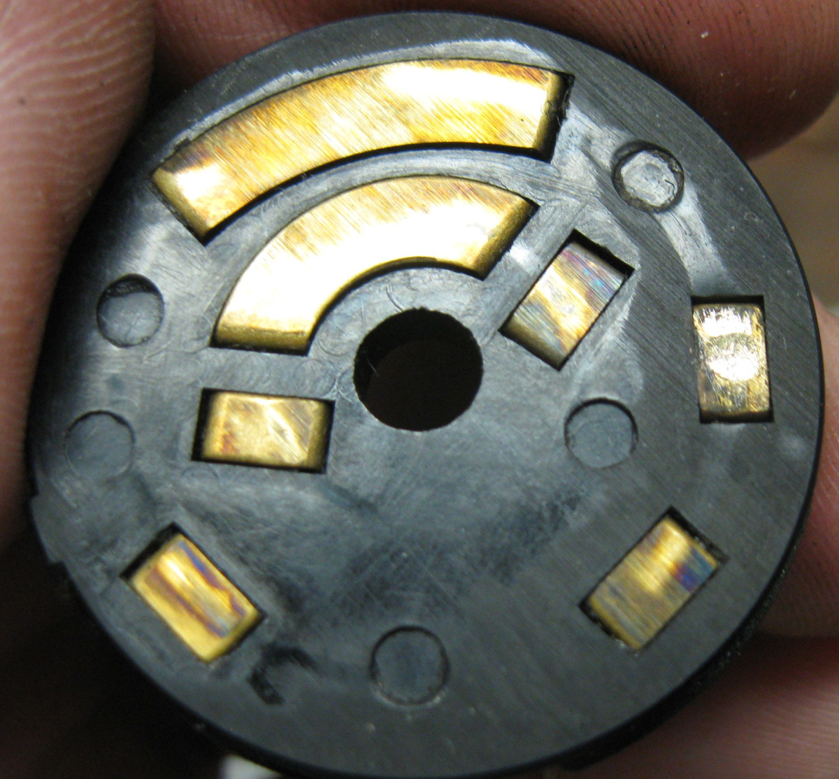 3) the black plastic lower assembly (stationary terminal disc), to which the wires are soldered to the outside lugs of the brass stationary contacts. The flat stationary contacts are on the reverse side from the wires, and are where the rotary contacts open/close the various circuits depending on the position of the rotor.
