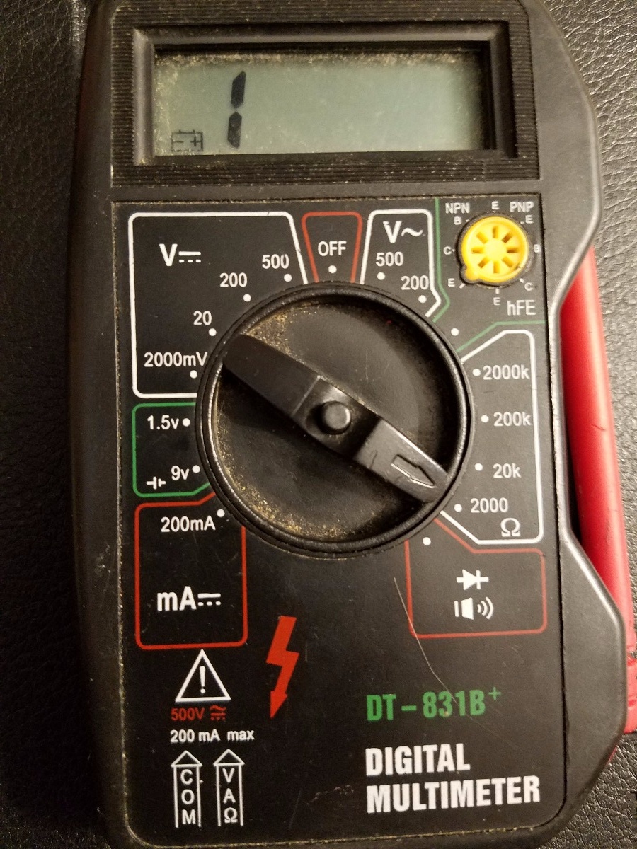 For the first test (+ -> yellow, - -> black) I had to set the meter all the way up to the 2000k range to get a reading. And those readings were around 1200 for both yellow leads. That seems way more than 20 ohms.