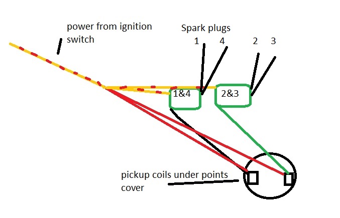 31 May 2018 15:08wiredgeorge wrote: First, turn on your ignition and see if you have 12VDC at the yellow/red connection to your coils. The two things you mention are both possible but the Dyna S is actually two pieces; the two pickup coils. If you are not getting spark on either the 1&4 or 2&3 side it is more likely they coils are not being powered than both are bad. How are you checking for spark? You will get spark regardless of how far off timing is but it just won't ignite the charge in your combustion chamber... we can look at timing once we figure out why no spark at all. Take a picture of your coils and the plug wires if you get a chance.