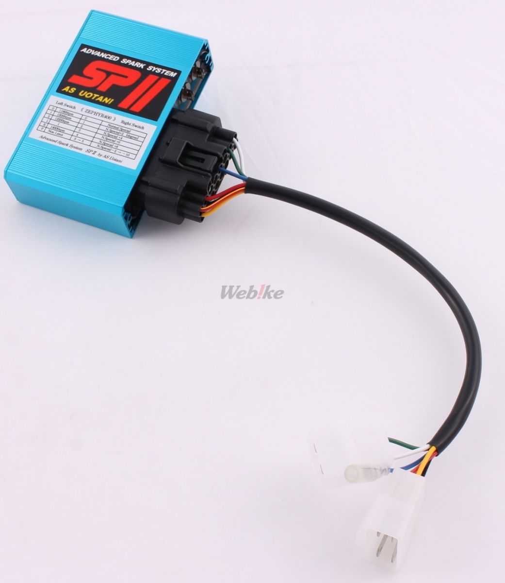 It's higher power than stock (40K volts versus 20-30K). The discharge current is 1.5 to 2 times normal and the discharge time is 2 to 3 times of normal. The primary coil resistance value of the SPII high power coil is 1.2 Ω (Normally 3 to 6 Ω). All that power allows you to increase the spark plug gap from 0.6 to 1.3mm. Comes with 10 ignition curves custom tuned to each motorcycle model (+8 advance to -10 retard) and an adjustable rev limiter. The manufacturer, Uotani, is famous in Japan and indeed the unit got rave reviews on Webike, all 4-5 stars, with Google translated phrases like "torque is overflowing" and "it is like riding liter bike for first time [for a zr400 review]."