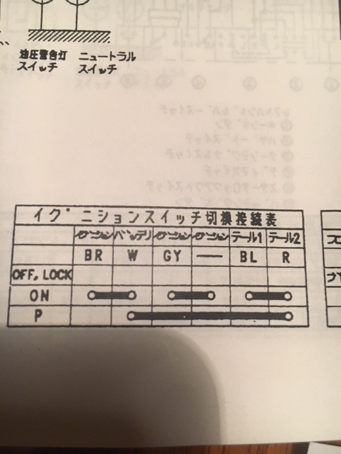Is this just showing, for instance, that BR and W are connected when the switch is set to ON? If so then the mystery GY wire is connected to "----", which doesn't seem very helpful. I'll ask a Japanese friend to decipher the text directly above the colors, though I can tell it's the same characters for GY, "----" and BR. Those all map to "IG" in the other diagrams.