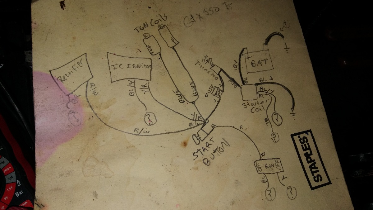 Also, your diagram doesn't show where you are getting power from. The coils and igniter need power. You said there's 12 v on those wires, so it's probably hooked up, but the diagram doesn't show it. Power for those things usually comes from the kill switch. You show the kill switch routing power to something in the upper right corner. Are those lights?