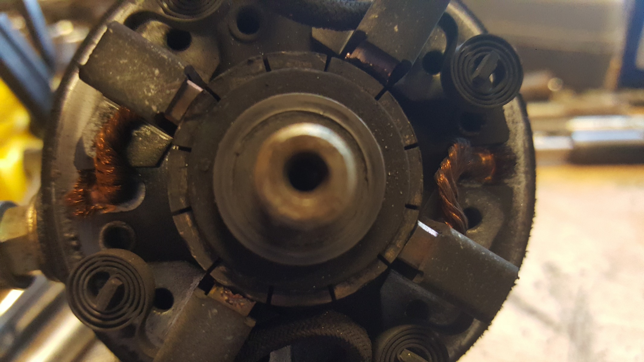 Wow, Matt, that sure let the smoke out of the brushes. The brush holder is charred white from heat. Like Steve said, it looks like the bushings are toast. and the armature was dragging, and cooked it hard. I don't even see any mica between the segments, although it has to be there, somewhere There was a thread a while back on some rebuild kits with 4 brush holders and bushings. I don't remember where, eBay, I think.