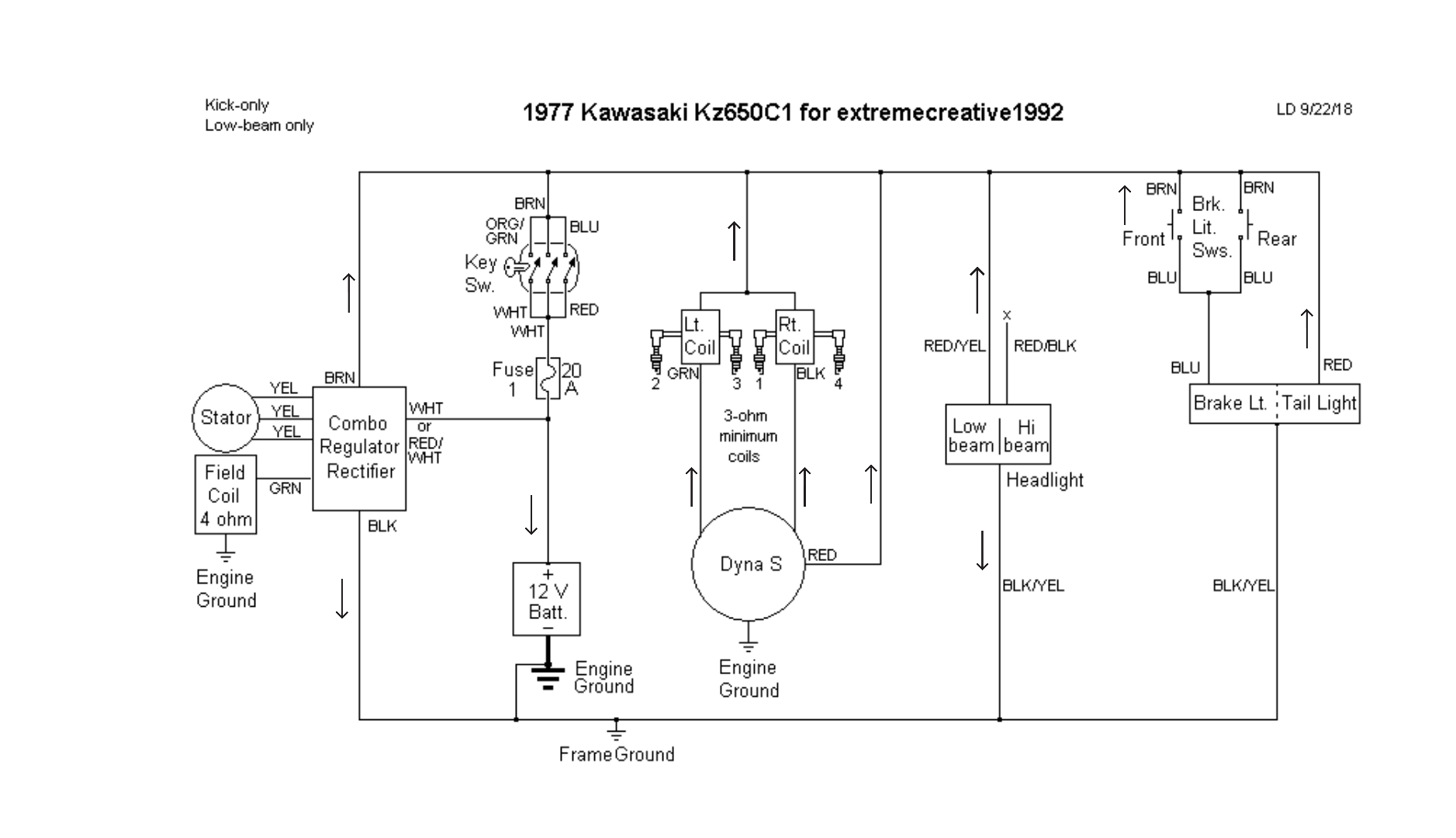About 3 months ago I bought my KZ650 and new I had my work cut out for me but it was running. Just very irregularly. By that I mean you'd kick it 20 times and it would start or it wouldn't start at all or it would start on the second kit. The original owner decided he wanted a cafe racer so he did all the wrongs things to get to that point. He hack sawed-off pipes. He tried to do a barebones wiring harness but it was just a spaghetti Mess I got new pipes and I installed them that was no problem. I took that the old harness and installed a new one. I'm going to post the schematic. Great diagram it's just the fact that it's still not starting. I have it down to barebones as in chicks start no push button starter headlight in key ignition and that's basically it. It does have a dyna s ignition and coils. I have tested everything up including the coils but not the electronic ignition. And I do have spark I checked but no start not even wanting to start. Please help. I live in Sierra Vista Arizona by the way if anybody lives even remotely close and can help