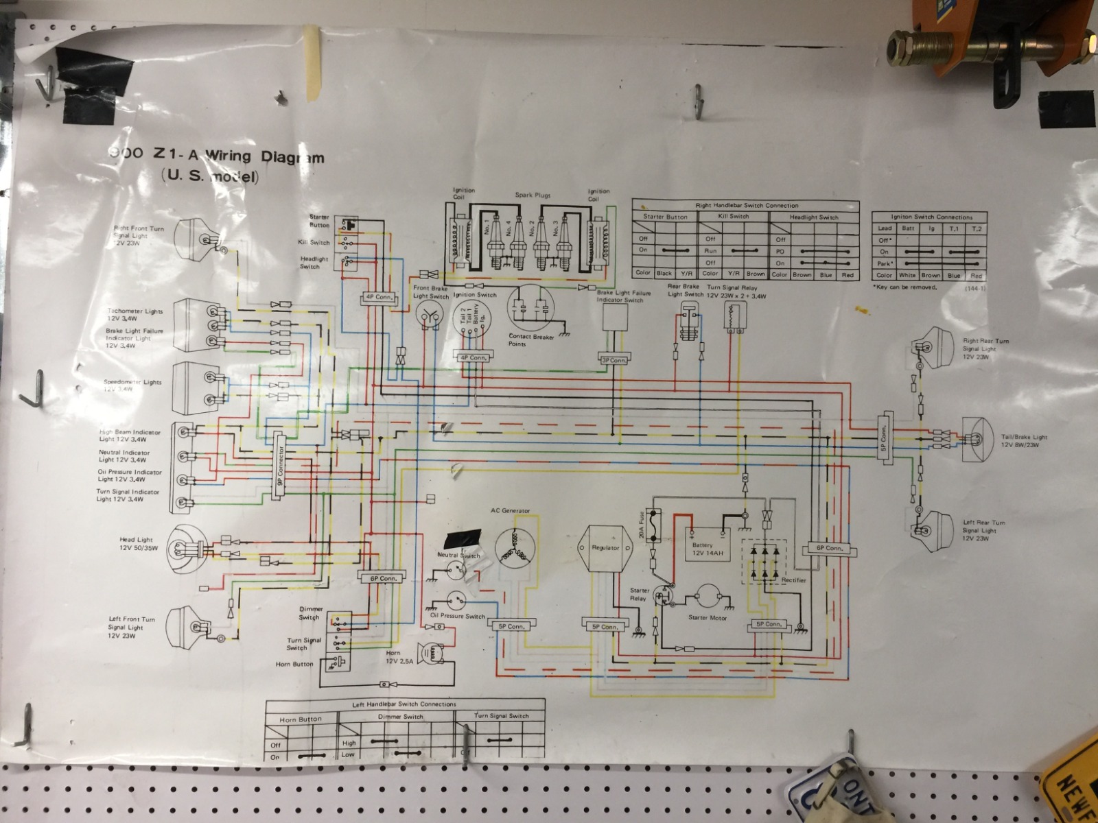 Attached photos show the entire Z1 electrical circuit (photo of my wall) and details of the neutral and oil switches. As can be seen in the detail...oil and neutral switches are grounded by the switch.