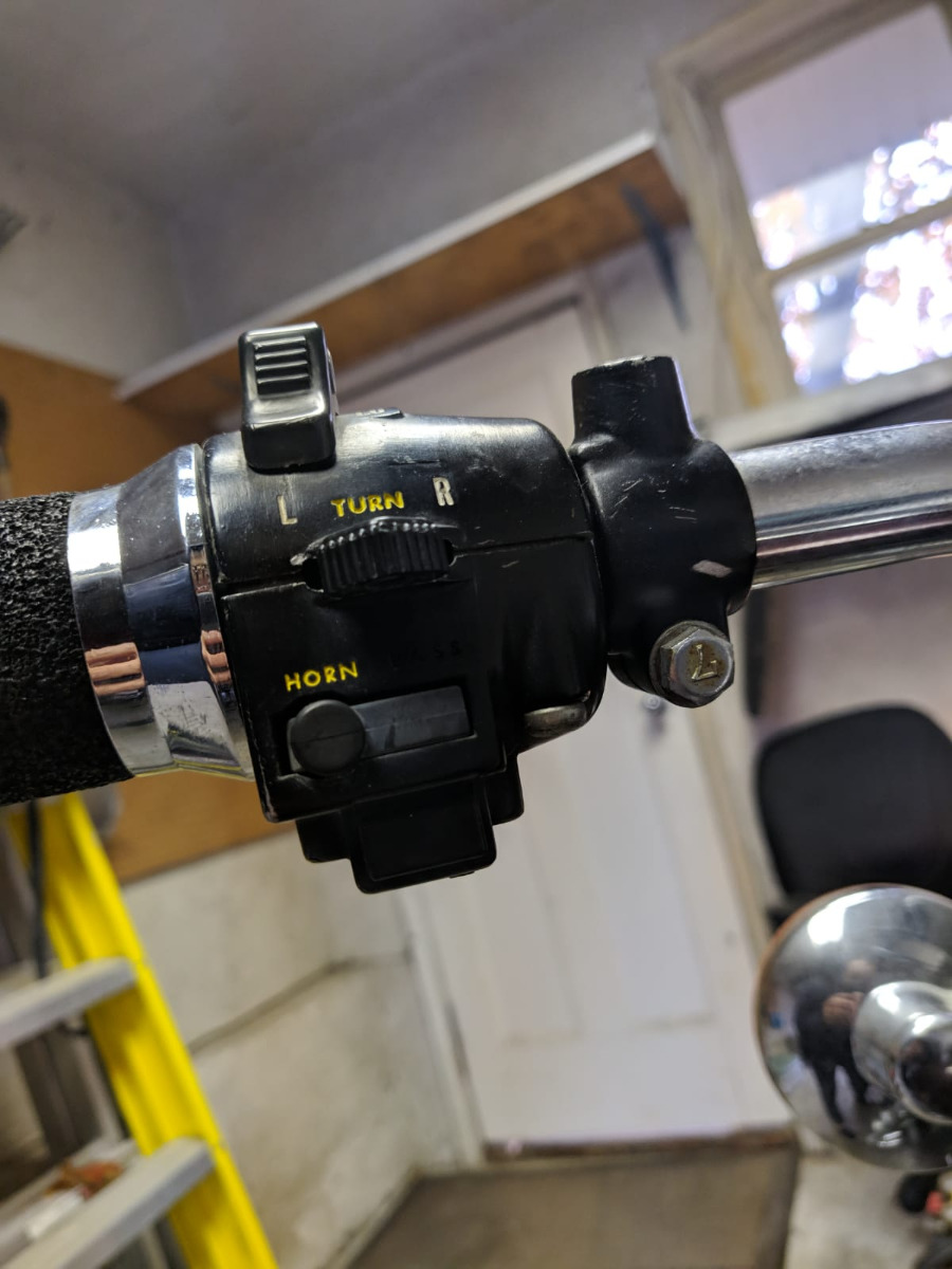 It seems a little strange, but the 1977 KZ650-B1 bikes did not come with the hazard switch while the 1977 KZ650-C1 bikes did. The right hand switch missing the ON/OFF for the headlight appears to be from a later KZ650. The 1977 controls came with the headlight ON/OFF switch but that was deleted on later models. Notice that the words LIGHTS, ON, and OFF are not painted on the switch on your bike; they were painted on the 1977 KZ650-B1 and C1 switch. The images below show the 1977 KZ650-C1 controls. Ed