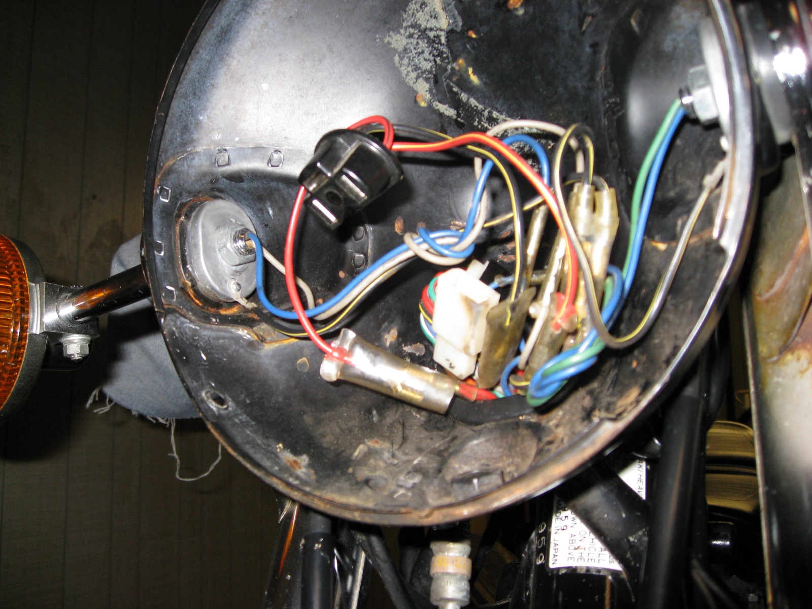 Here's a pic of the inside (before I cleaned it up) of the headlight shell of my 1977 KZ650-C1. The turn signal wiring looks the same. Ed