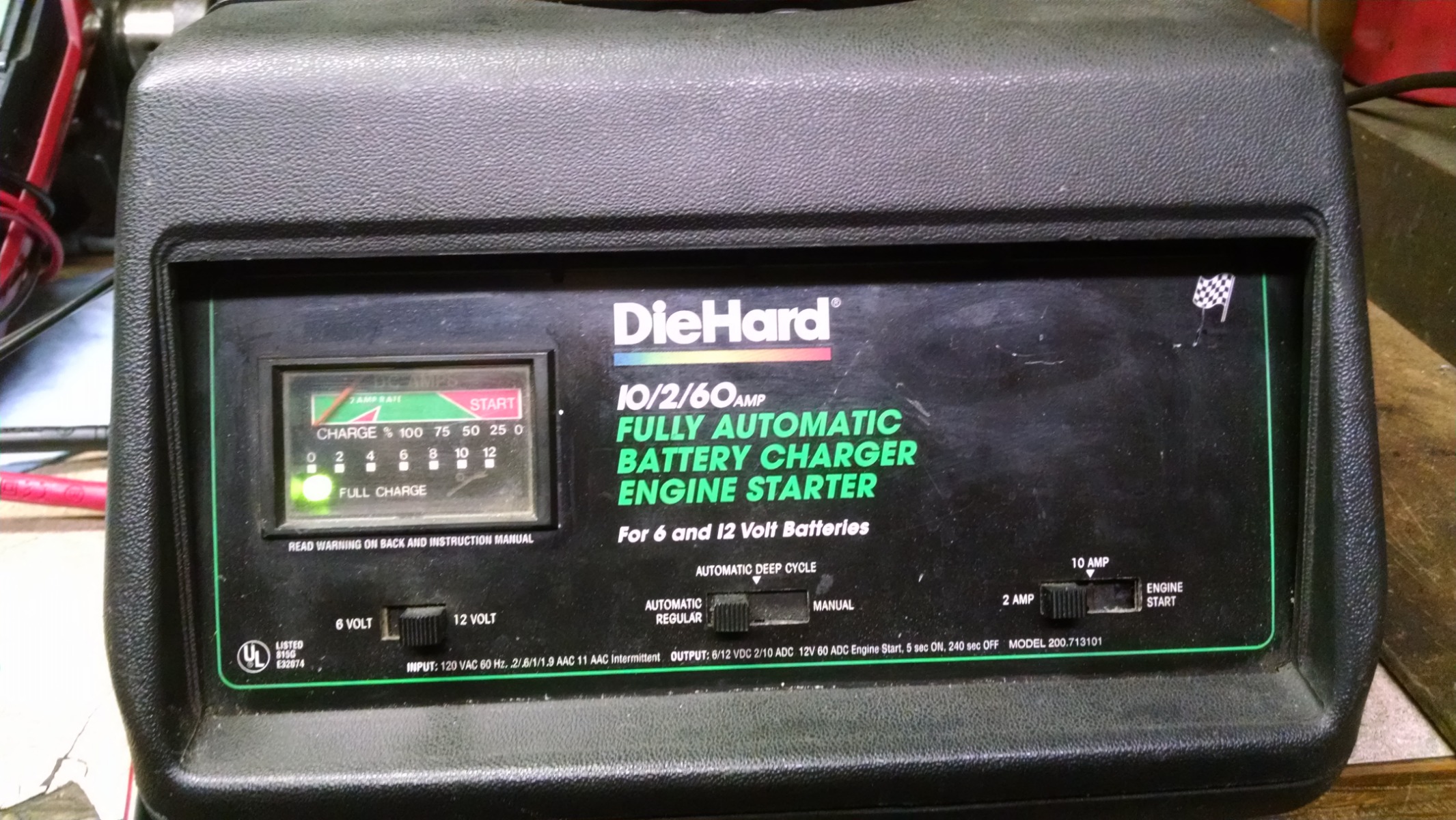 This is my fully automatic Diehard charger (Craftsman?) . Been using it for many moons. It seems to work much like the BTJ, except it is too big to mount under a side cover. I had put it on my bike a few days ago when I started the bike after it had sat idle for a month or better. (battery was not low BTW) When It feels like it has flogged the battery enough, the current drops to zero and the green "full charge" LED activates.