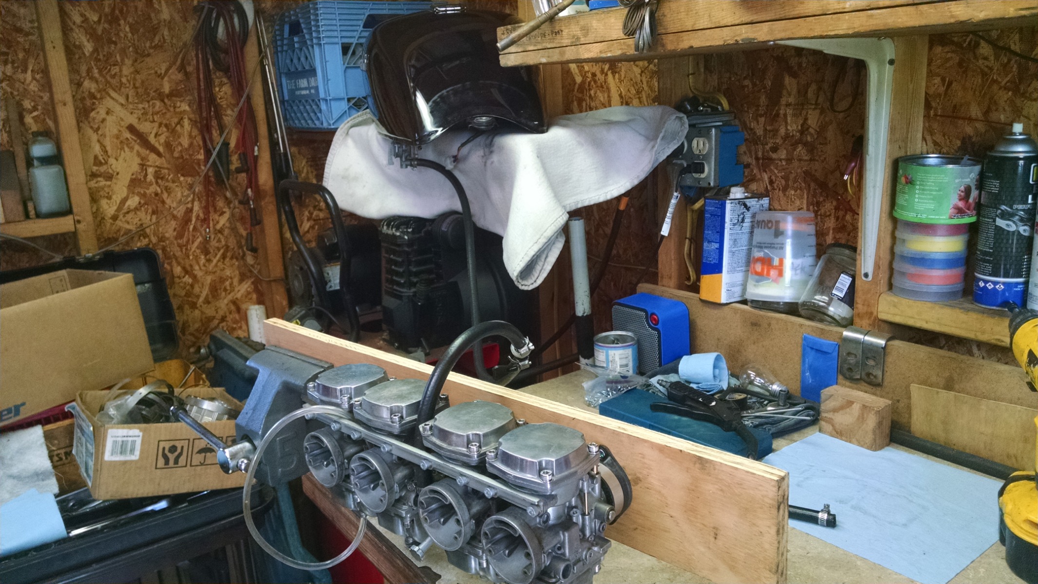Don't position the fuel tank too much higher than the carbs, to keep the static fuel pressure about the same as when mounted on the bike. Note that the clear tube is ~6" from the carb (looped out) If you move it in, up down, or curl it up, the fuel level will remain the same. Simple physics.