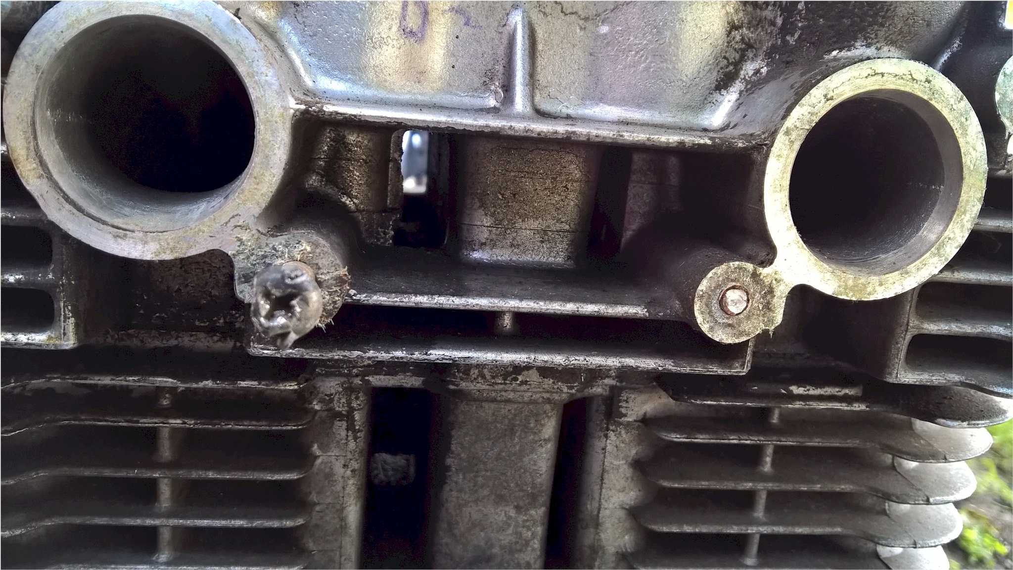 The one on the left you can see came out using the chisel method I described. Note how the cuts in the head come from the side, but are angled slightly to spin out the screw. You have to alternate taps 180 degrees apart to cause the head to rock back and forth otherwise you will just chisel the head off.