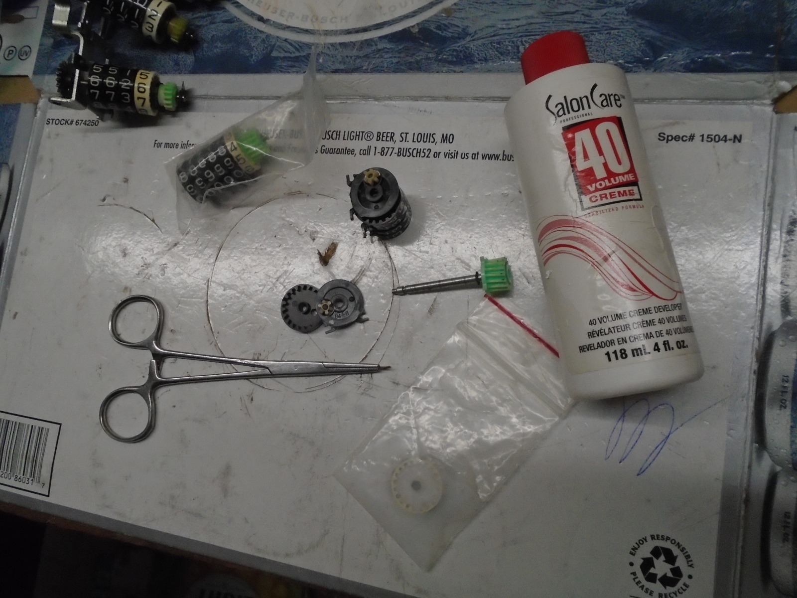 For Kaylinator and his KZ1000 and whoever else? This is what i do to whiten the registers for trip and mileage. A bit involved but once the needle and face are off..... I remove the Mileage register with a "custom" vice grip. The metal is folded over the shaft on the mileage register. One side requires opening quite a bit, the other just enough to relieve tension so the shaft can be slid out. A little brass e-clip has to be removed to slide the wheels/plates and gears off. Pay attention as to how they are removed to aid reassembly. Use a little baggie and pour in the Peroxide and whatever wheels need whitening. Let it sit in the sun for as long as it takes, check every couple hours. Wipe, don't rub, numbers won't be affected.