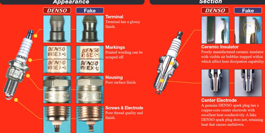 When we were looking for counterfeit plug ID info it seemed all we could find was for iridium plugs. This morning we found the image below from the 2020 ND catalog. It shows conventional plugs, but lacks a little detail. There are a few youtube vids purporting to compare fakes vs genuine, but we've not watched any of them.