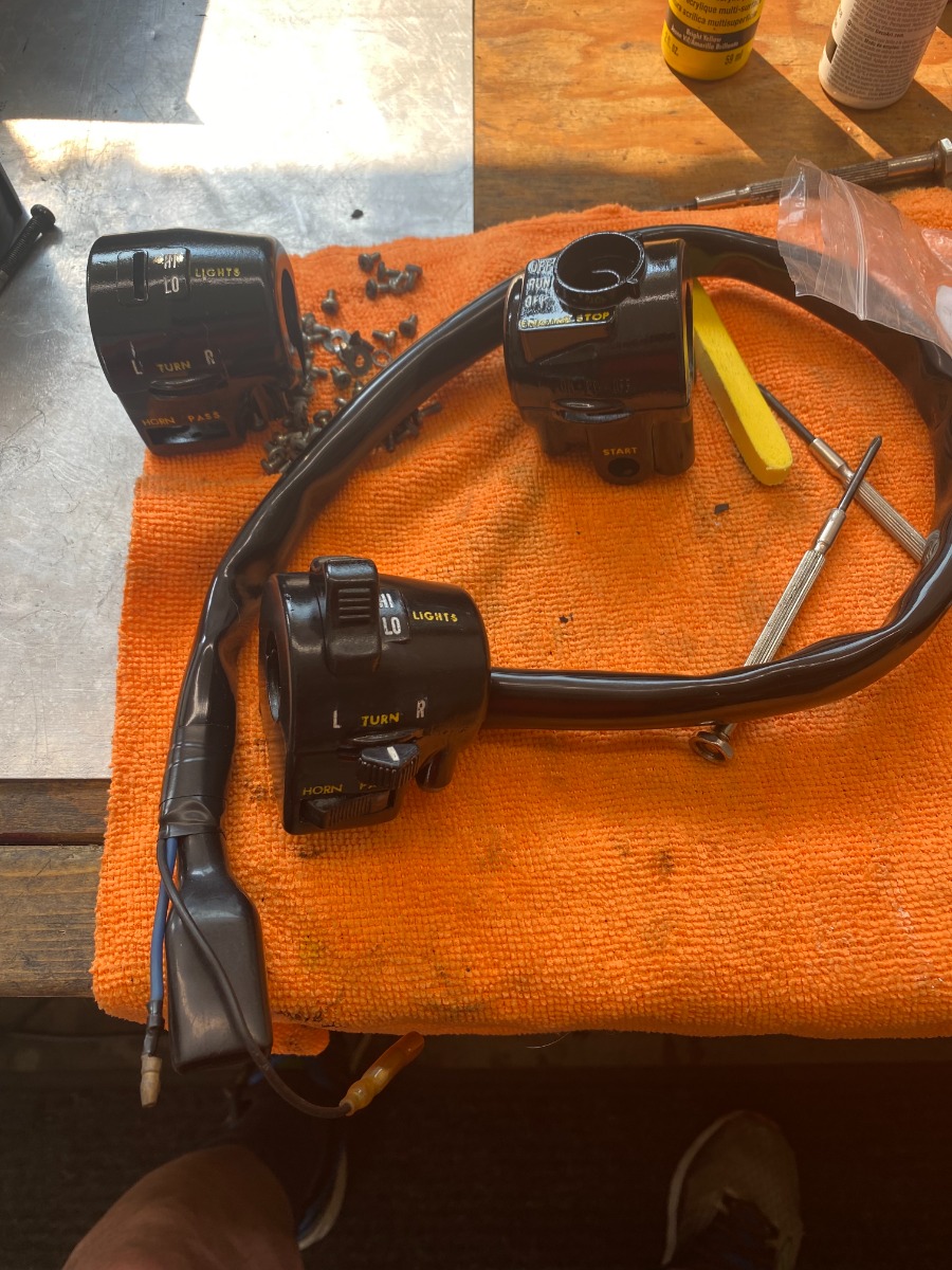 I was planning to take the shells to a friend of mine to sand blast them but he has a bad wrist and hasn't had his shop open for a while. So I decided to do them myself. I used paint stripper and a brass wire brush to clean them to bare metal. Then polished them with a wire wheel in my drill. Then thoroughly cleaned them of any grease or dirt. Then two coats of flat black primer...one day apart. Two coats of high temp enamel gloss black. Paint stick for the lettering. Then two coats of POR15 clear. Same wires but in a new sheath.