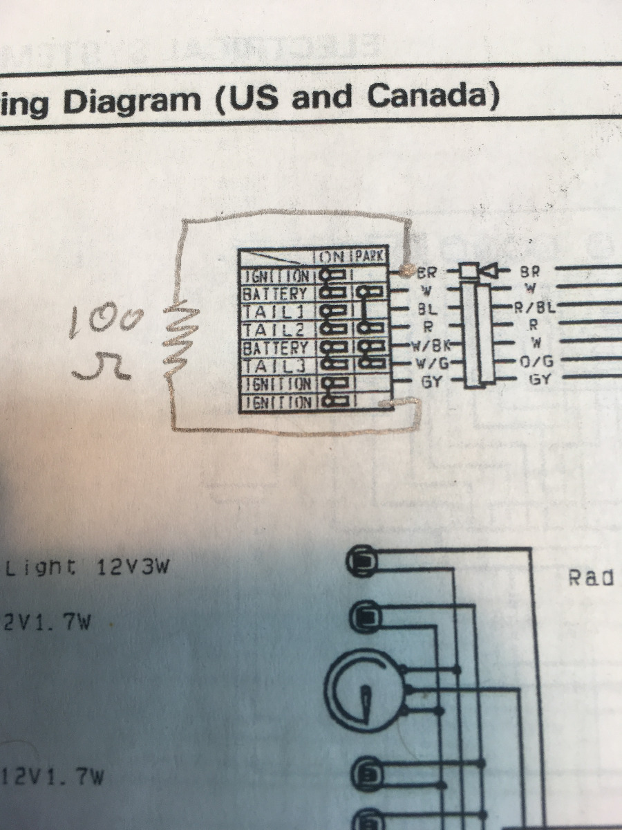 I figured out why my ZRX will crank forever but not start once in a blue moon!I have been thinking about it due to a few responses I posted in bikes not starting threads so I decided to figure it out. Armed with the wiring diagram and the new ignition switch I bought 4 years ago I proceeded to investigate. The first thing that caught my eye was the grey wire from the ignitor to the ignition switch with no other connection point along the way. And there didn't appear to be a connection for it at the ignition switch either, an unused wire as it were. Pulled out the meter and started checking the grey wire to all the other wires with the switch off and then on. While in the on position I get 101 ohms to the brown and white wires so I pull the cover off and discover a resistor that's not shown on the diagram. Must be an anti-theft measure. The actual problem goes like this: this circuit is very low or essentially no current as it's just a signal to the ignitor. The switch contacts are most likely silver - cadmium which is used for high current switching. This type of contact needs a minimum of 10 ma current to clean itself or an insulating oxide forms on it, not a problem for all the other contacts as they switch at least a few amps. But the contact for the grey wire oxidizes due to insufficient "cleaning" current causing the no fire condition. Rapidly twisting the switch cleans the contact due to wiping action restoring the circuit and the bike fires off. The new switch in fact exhibited this issue the first time few times I turned it on giving a higher reading before settling down. In my controls career we used relays and switches with gold or gold flashed contacts for these low current signal applications.There is nothing to do unless the ignition switch fails for another reason. If your Rex cranks but doesn't fire twist the key rapidly several times, or permanently hook the grey wire to the brown\white wire through a 100 ohm 1/4 or 1/2 watt 2% resistor right at the ignitor. Then cut out the resistor in the ignition switch or don't hook up the grey wire going to the ignition switch when you wire in the resistor at the ignitor, you only want 1 resistor in the circuit.I have included the corrected wiring diagram portion.