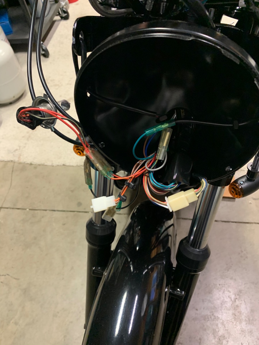 Might as well show these. Power wires from loom.. clutch switch wires and headlight bucket. And additional red wire I added from the dyna coils.