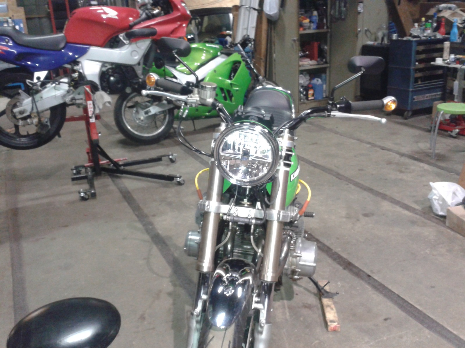 76 KZ, frame gusset work,1200CC.Ported by Larry Cavanaugh, 1.5mm.over intakes, Carron Pipe, ZRX12 rear end, and seat,96zx9 front end.
