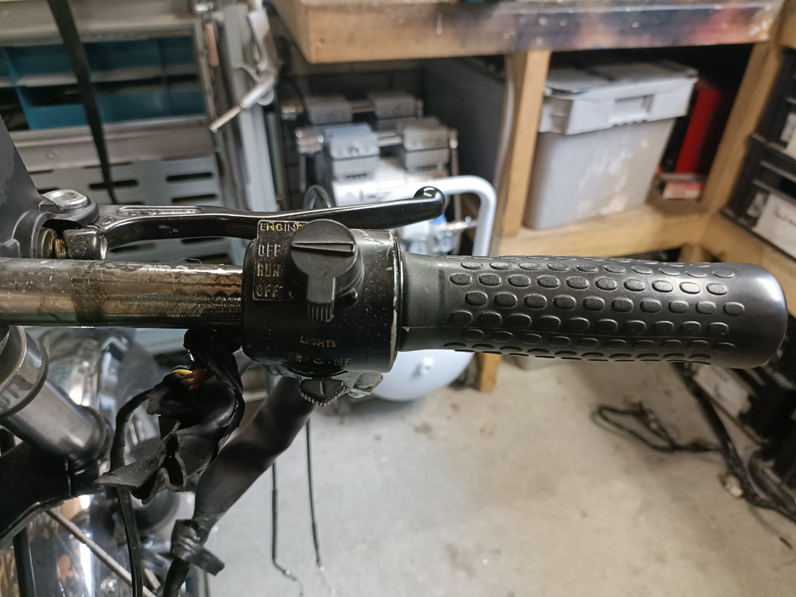 Next up is the new wiring for the lights etc. I was planning on installing a 5 button bracket inside the bikini top, for lights, start and stop button, and empty out the handlebars. The left buttons are simple to remove, for they are on their own.. Right side is in one piece with the throttle handle, do you guys have a nice replace set fit for the 70's?