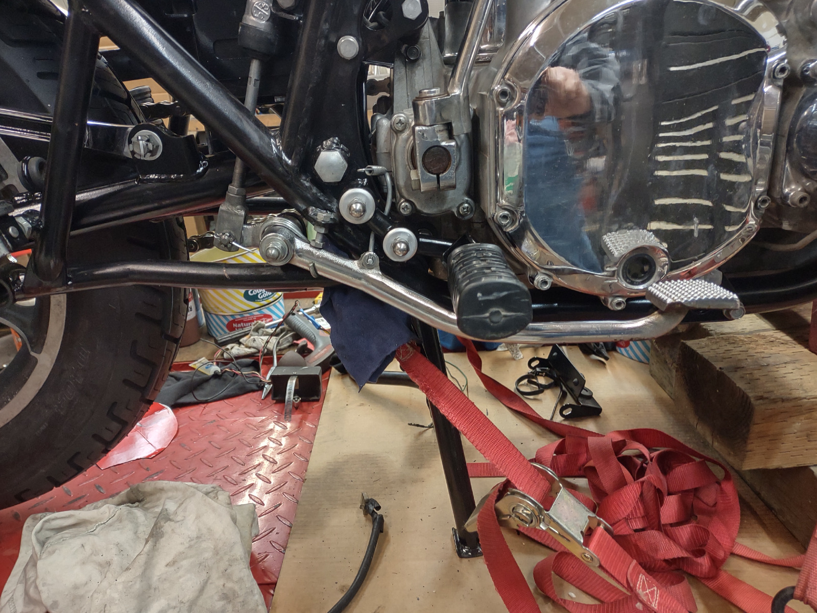 You can see the battery ground wire bolted to the engine case just below the motor mount. Never mind that it is a Honda bolt, it had a battery terminal bolt there when I got the bike. Every non-Honda bike we've resurrected has at least one Honda bolt on it somewhere.