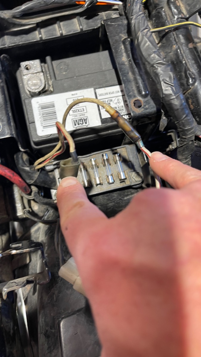 End next to the fuse box thumb comes out of the Fuse box , splits with one side, going to the starter relay? The other side of the split is supposed to connect to the battery… I guess I’ll check Continuity?