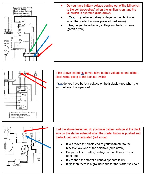 Howdy y'all. This weekend I started to install all the lights and other electrical components on my 750. When I turn the key to ON, the headlight, tail light, and idiot (warning lights) all turn on. When I try to hit to starter button, nothing. I've chased the wires and the only place I DO NOT have power is the starter button/right controls. Mine is equipped with a starter lockout switch and its good. I've even bypassed it with a jumper, still nothing. What am I missing? Is my starter relay bad? The right controls? Any help would be greatly appreciated.