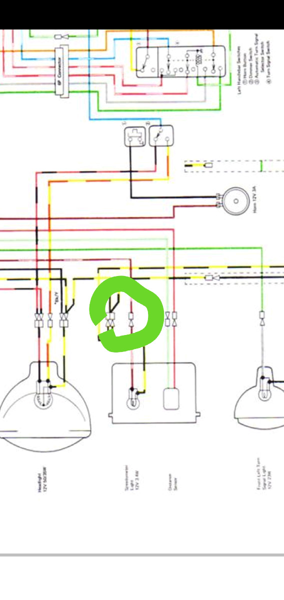 So, I studied and studied the schematic, and metered and metered and metered. Almost everything on my bike follows the schematic of the 1982 440-D4 USA model, except that goofy splice where the front turn signals, tach and speedo lamps are hard wired into the red/blue tail light circuit. So, it seems to me like they are getting voltage from the tail light circuit when the ignition switch is engaged, and they are getting voltage from the other side from the turn signal relay when the turn signals are engaged at the left handlebar switch.
