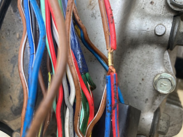 So, here's a point of high strangeness. I couldn't get any change in continuity readings by wiggling the length of the wiring harness. Ends of wires and plugs also looked good. So I decided to unwrap the harness, and found this splice in the middle of the red/blue wire under the tank. This is not in my schematic at all. Here's what I know: