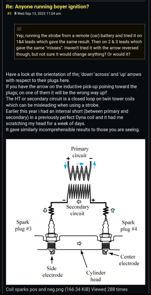 30 Oct 2023 07:48I am a long time "out of school" but it is my understanding that this phenonium is more relevant to later "coil per cylinder" type ignitions but I am happy to be re-educatedOn the clamp of the strobe you'll see that it has an arrow on it. On which ever lead flashes consistently the arrow is likely pointing towards the plug. When you switch it to the other lead which way is the arrow pointing?