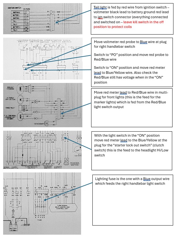 Would the rest of the testing be done where the right hand switch plugs into the wiring harness (under the gas tank)? Yes, and where the left hands witch plugs in for the check on the Blue/Yellow at the lock out switch plug and the Hi/Low switch