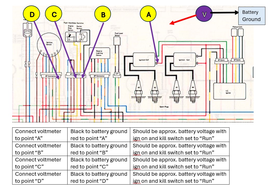 It appears I do not have voltage going to my coils, possibility of a short in the kill switch? Might not be connecting the black probe to the right bit, not sure if I can just ground it anywhere. No difference with kill switch and ignition on and off