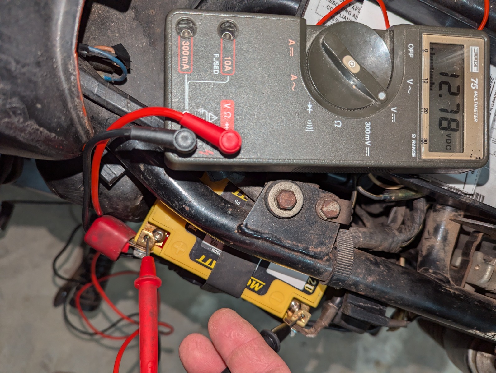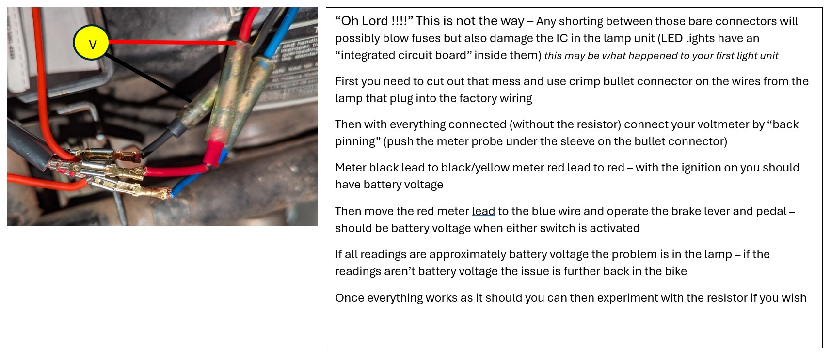 Thatyeti, hi hope you don’t mind me chiming in. Your last pic shows meter set up correctly DC setting. Now connect black lead from your meter to Negative post on your battery or a place on the frame, then to make sure meter is working correctly touch with the red lead the Positive post on battery. See what you get, if battery is charged you should get about 12volts. Now use the red lead to touch the wires you joined. Put your red lead on one wire and hit the brakes see if you get 12volts. Do this for each wire you spliced together. It’s a troubleshooting process but this will get you handy with the meter. Patience it’s a process