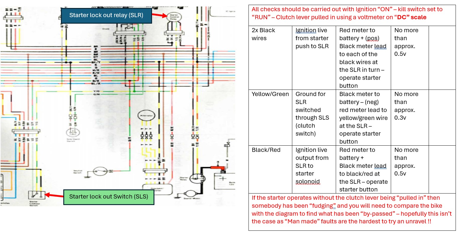 Do these bikes have a low voltage cutoff for the starter? I bridged the contacts on the starter solenoid, and the bike fired right up. I was not getting voltage at the trigger wires for the solenoid when holding the button. The lights on the rest of the bike dimmed very slightly when i hit the button. The clicking i heard is from something under the right side panel.