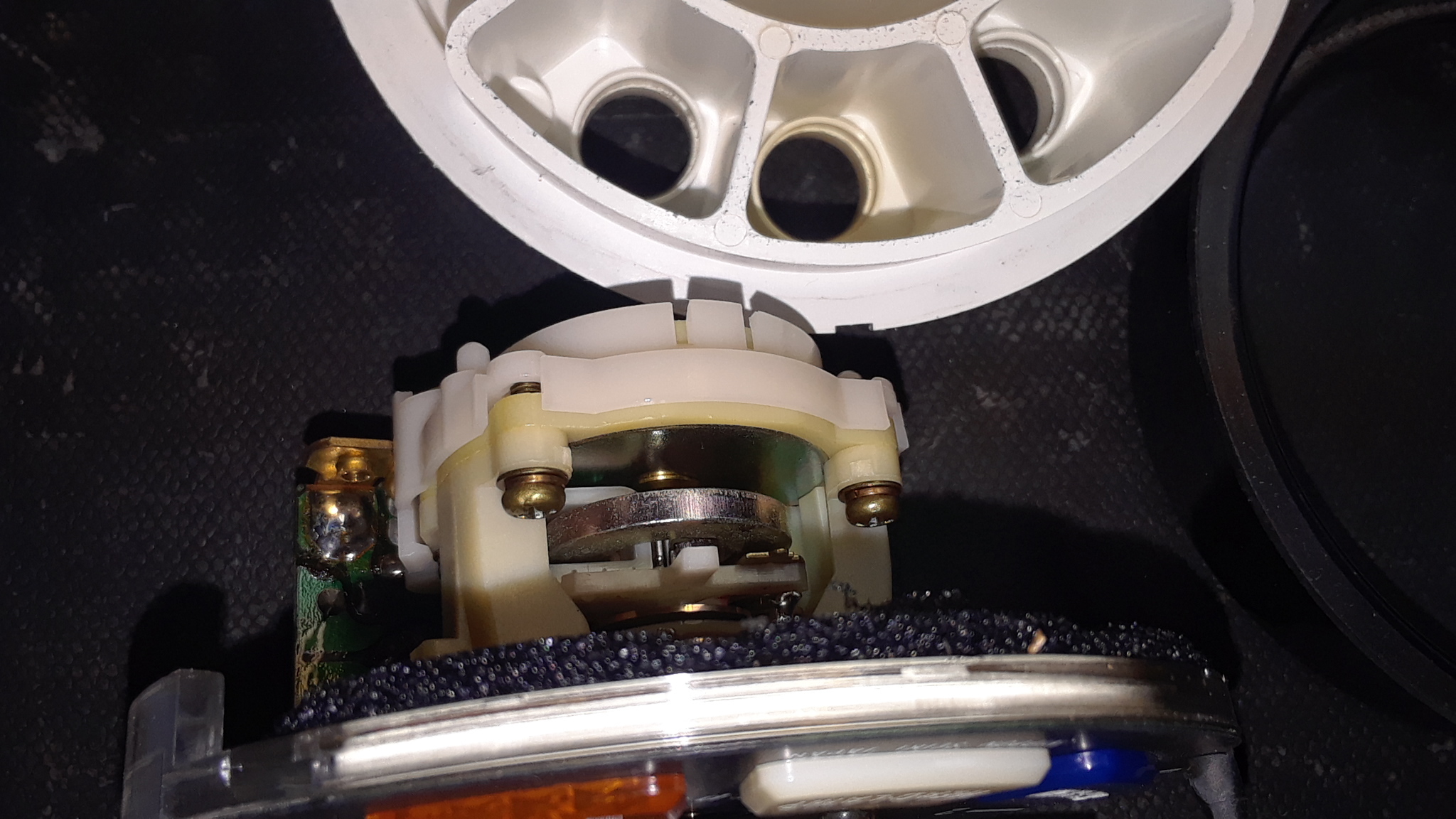When I got the gauge, it was working at low speed, but the needle would stutter and bounce above ~50mph. I initially suspected it was an issue with the electronics, but that was wrong. The issue was that the coil spring that returns the needle is also used as the electrical circuit path to the galvanometer. The fixed end of the coil spring is just soldered to a tab, and the solder joint had broken. However, the spring was still touching the tab when the needle was near the rest position. As the needle started to sweep, the connection became intermittent and the needle would bounce.