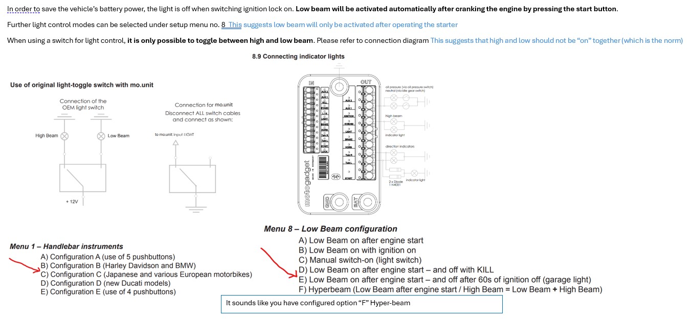 28 May 2025 11:49I disconnected the bulb today and took some measurements:Interestingly, there is always 12V between the low beam and high beam wires, but the polarity changes depending on whether the high beam is activated or not This makes little sense since both "high " and "low" are fed from the Mo-Unit - if the high/low switch is wired correctly this would point to a configuration issue (if I get chance I will look at the moto gadget manual tomorrow) . Could this behavior help explain why the high beam indicator on the speedometer isn’t working correctly? Potentially as the indicator is a LED so polarity sensitive (The speedometer input has high resistance.) That is normal given you are measuring an LED