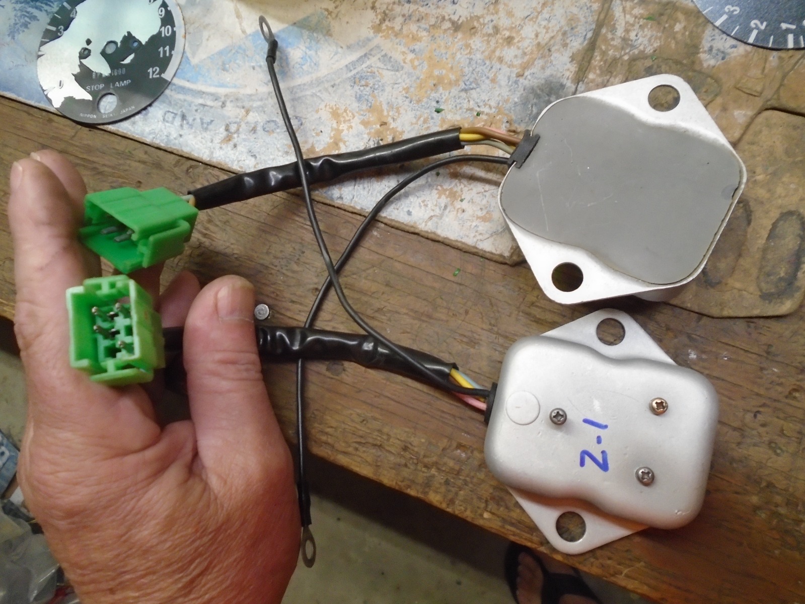 Here are pics of my current connector board and my regulator and rectifier which appear to have been replaced a while ago. Isn't that the regulator attached to the bottom of one coil?