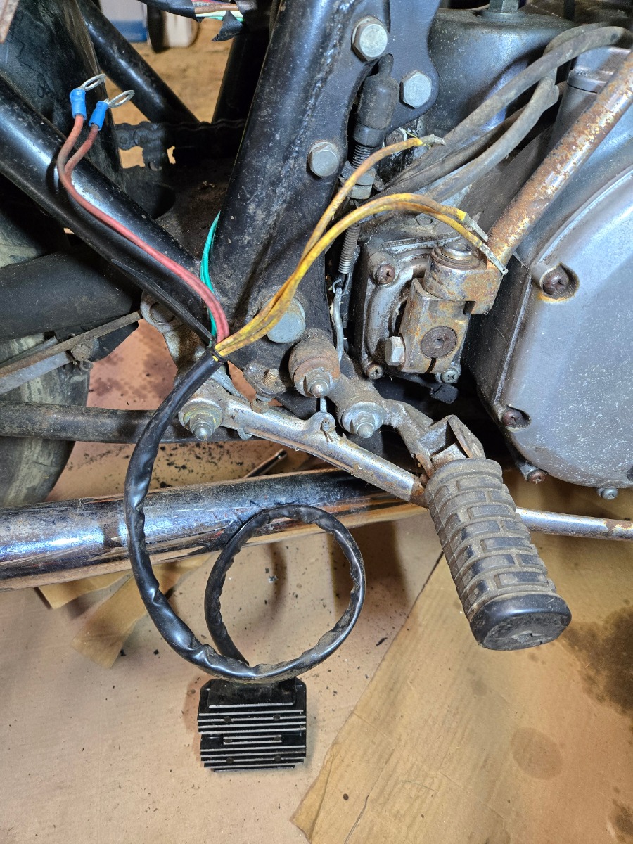 Wiring, probably should get 4 harnesses, Main, rear lighting, front instrument, and the junction block, yours are probably too far gone, that thing bolted up to the coil area with the cardboard shims looks like a replacement combo regulator, good place for too much heat, should be under battery, that’s why white plug is empty, original rectifier/diode from charging system, your old shop mcgyvered a few things!!! if you get a new harness, leave old in place and lay new next to it, match up connections and plugs, good luck